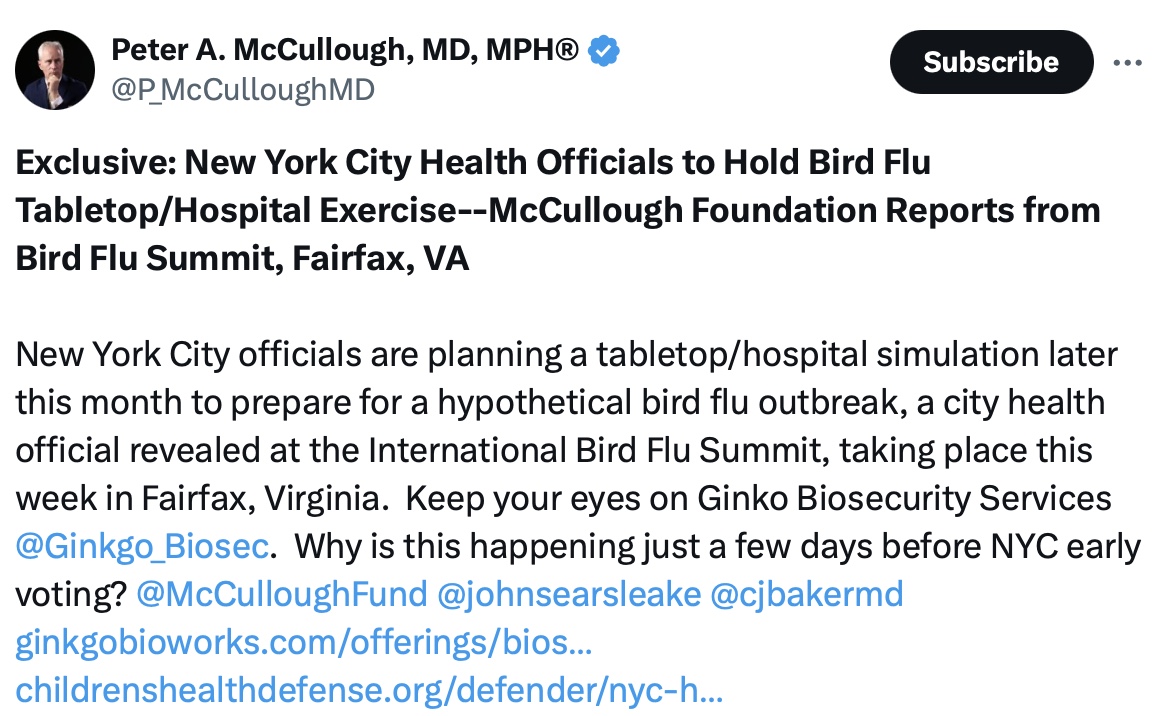John Leake, of the McCullough Foundation, attended the event. He states, “The timing of the Summit is auspicious. Like COVID-19, which arrived in the United States during the election year of 2020, the introductory speaker emphasized that the first case of human-to-human transmission of H5N1 was just detected in Missouri, less than two months before the 2024 presidential election.”