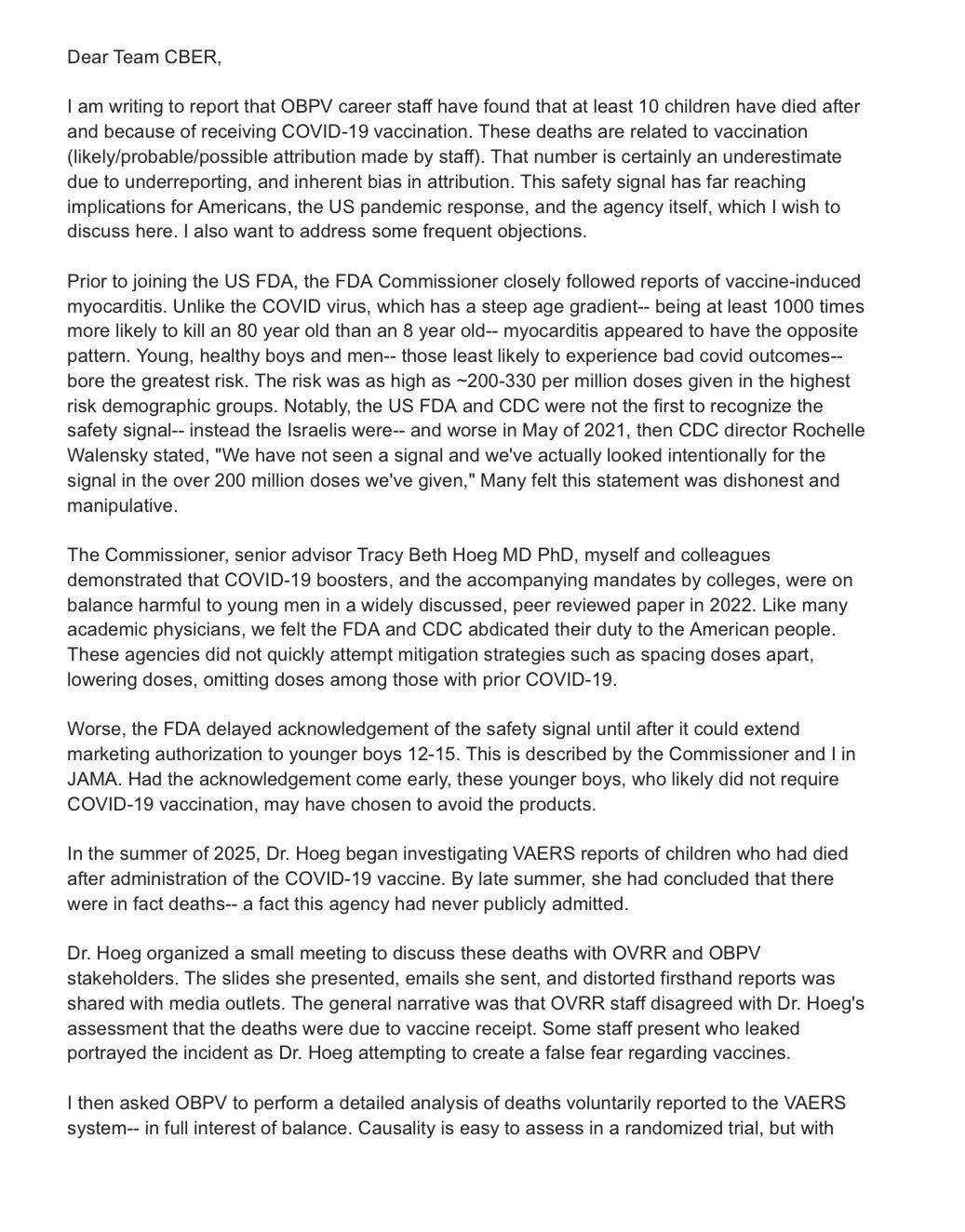 The meme stated, “Dear Team CBER, I am writing to report that OBPV career staff have found that at least 10 children have died after and because of receiving COVID-19 vaccination. These deaths are related to vaccination (likely/probable/possible attribution made by staff). That number is certainly an underestimate due to underreporting, and inherent bias in attribution. This safety signal has far reaching implications for Americans, the US pandemic response, and the agency itself, which I wish to