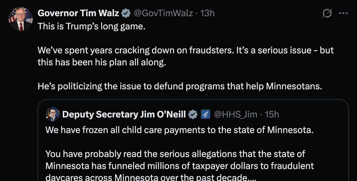 Gov. Walz, a Democrat, has sharply criticized the federal action as reckless and politically motivated, accusing the administration of using Minnesota families as leverage in a broader partisan fight over fraud and welfare programs. Walz insists the state has already increased oversight, boosted its own investigative capacity and moved to crack down on bad actors, arguing that a blanket funding freeze punishes legitimate providers and the families who rely on them.